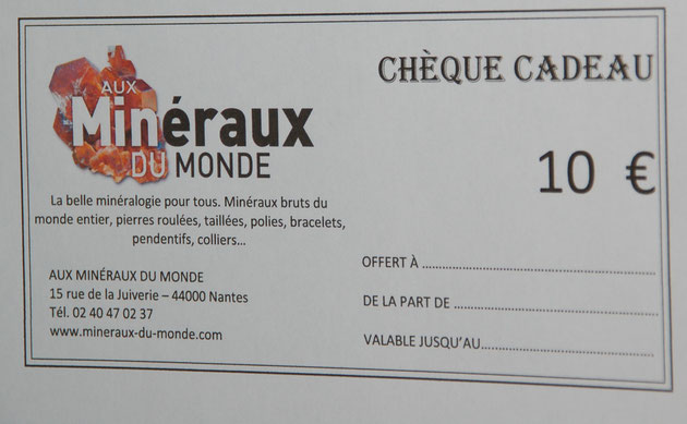 Offrez un CHÈQUE CADEAU "Aux Minéraux du Monde". Ainsi, plus de risque d'erreur puisque le destinataire choisira lui même son cadeau au magasin.
